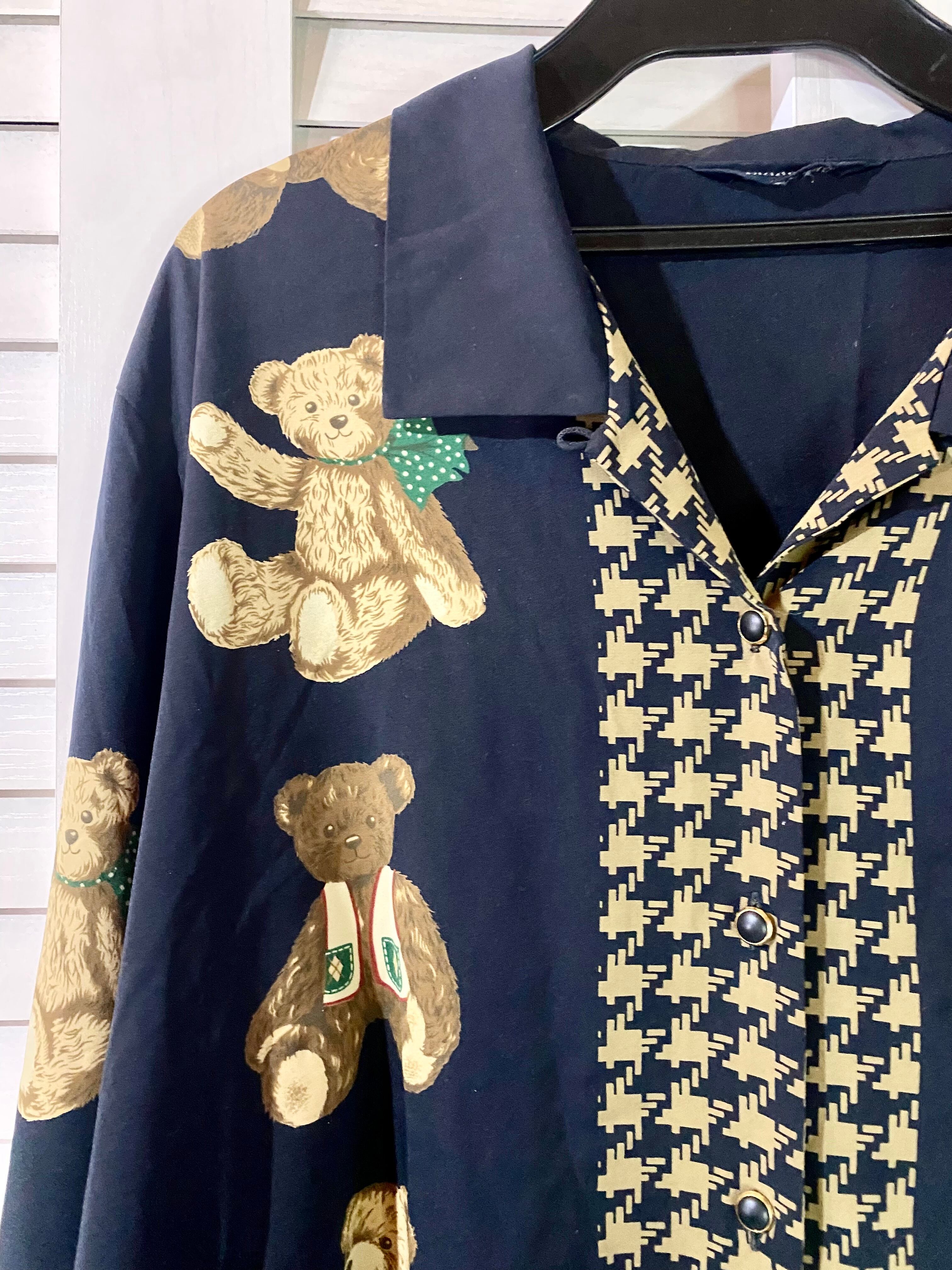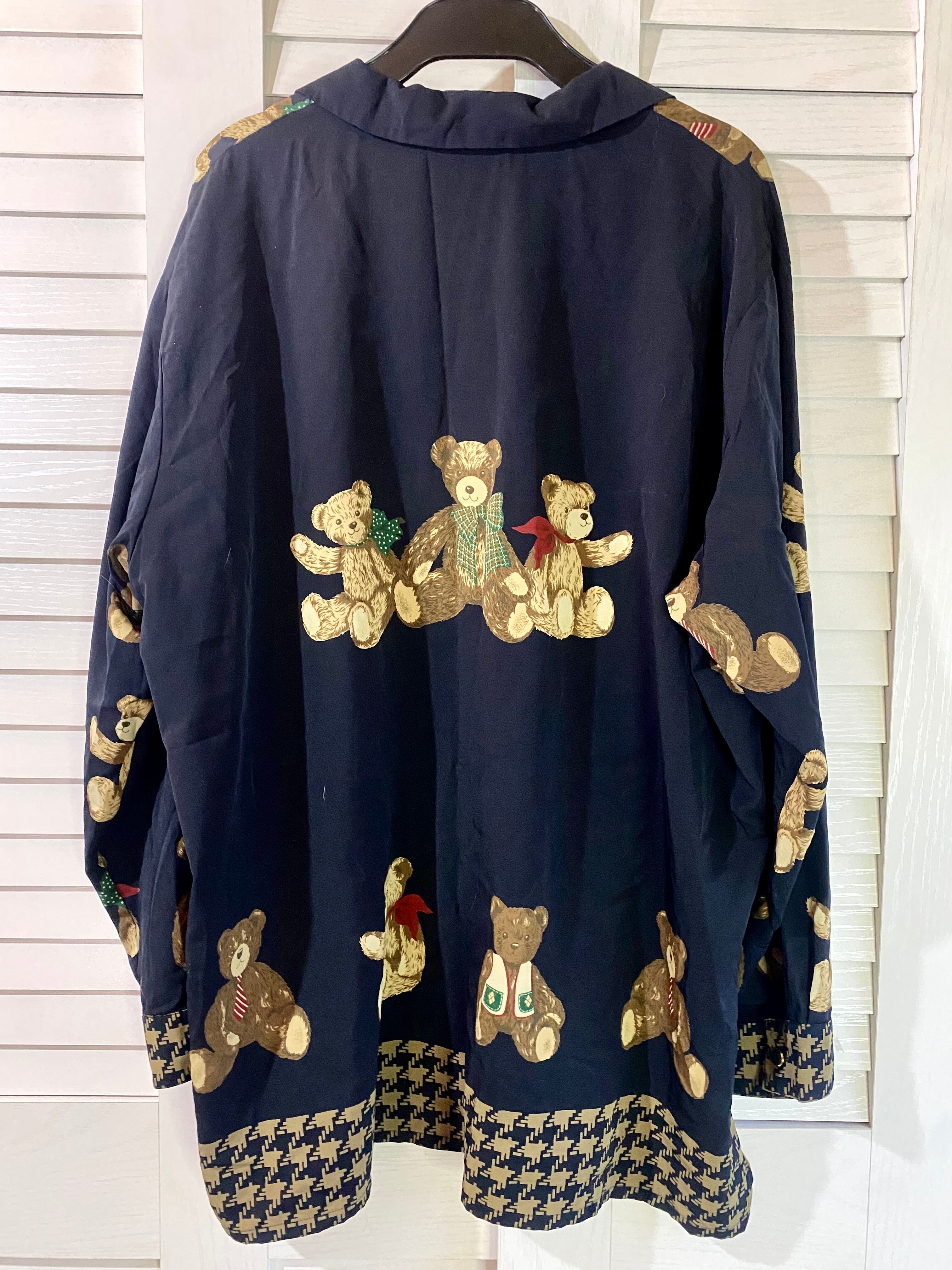 #172【古着屋購入】80Sヴィンテージ テディーベアプリントオーバーサイズサテンシャツ ネイビー