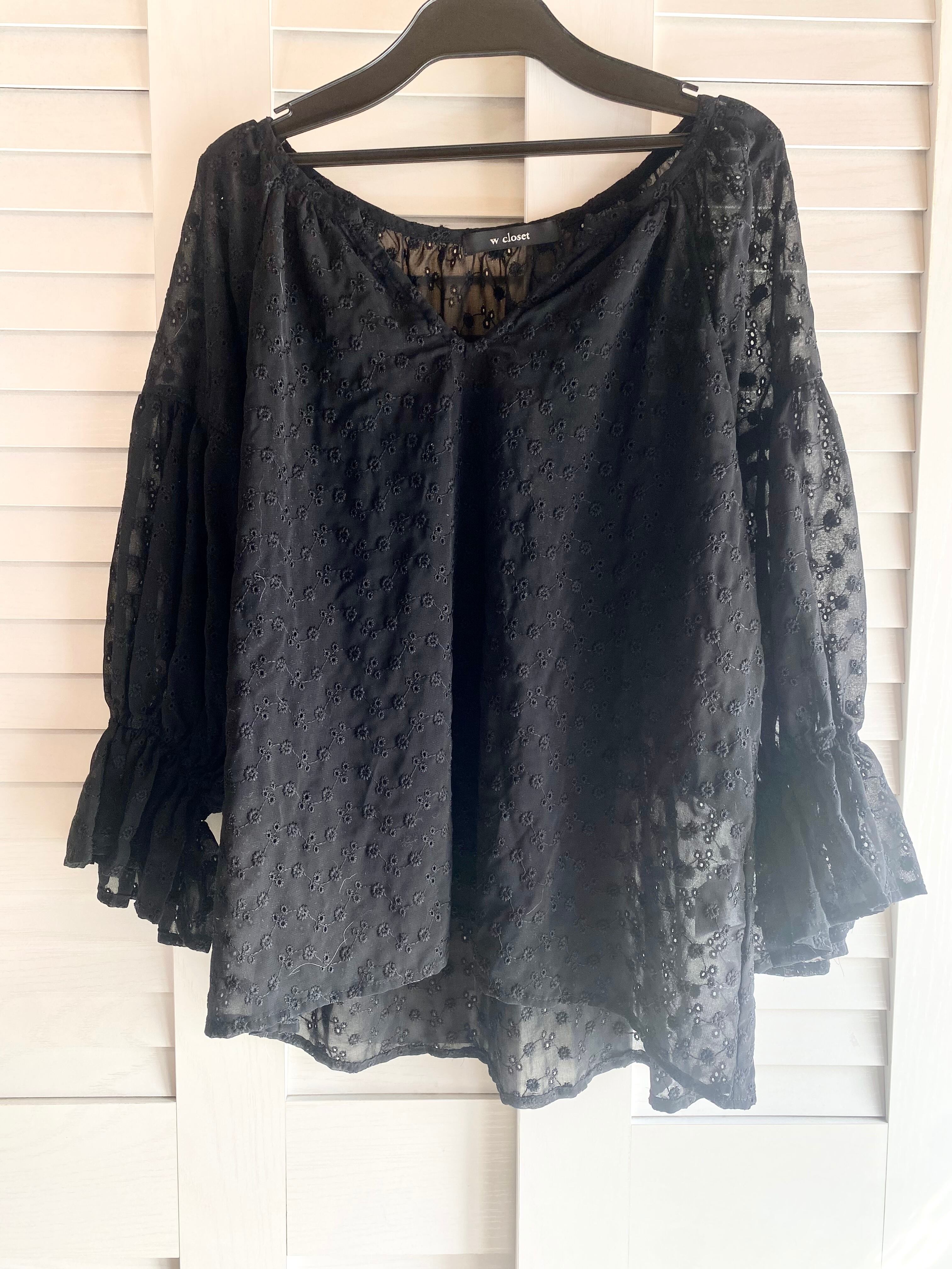 #174 w closet シアーシフォンカッティングレース キャンディースリーブブラウス ブラック