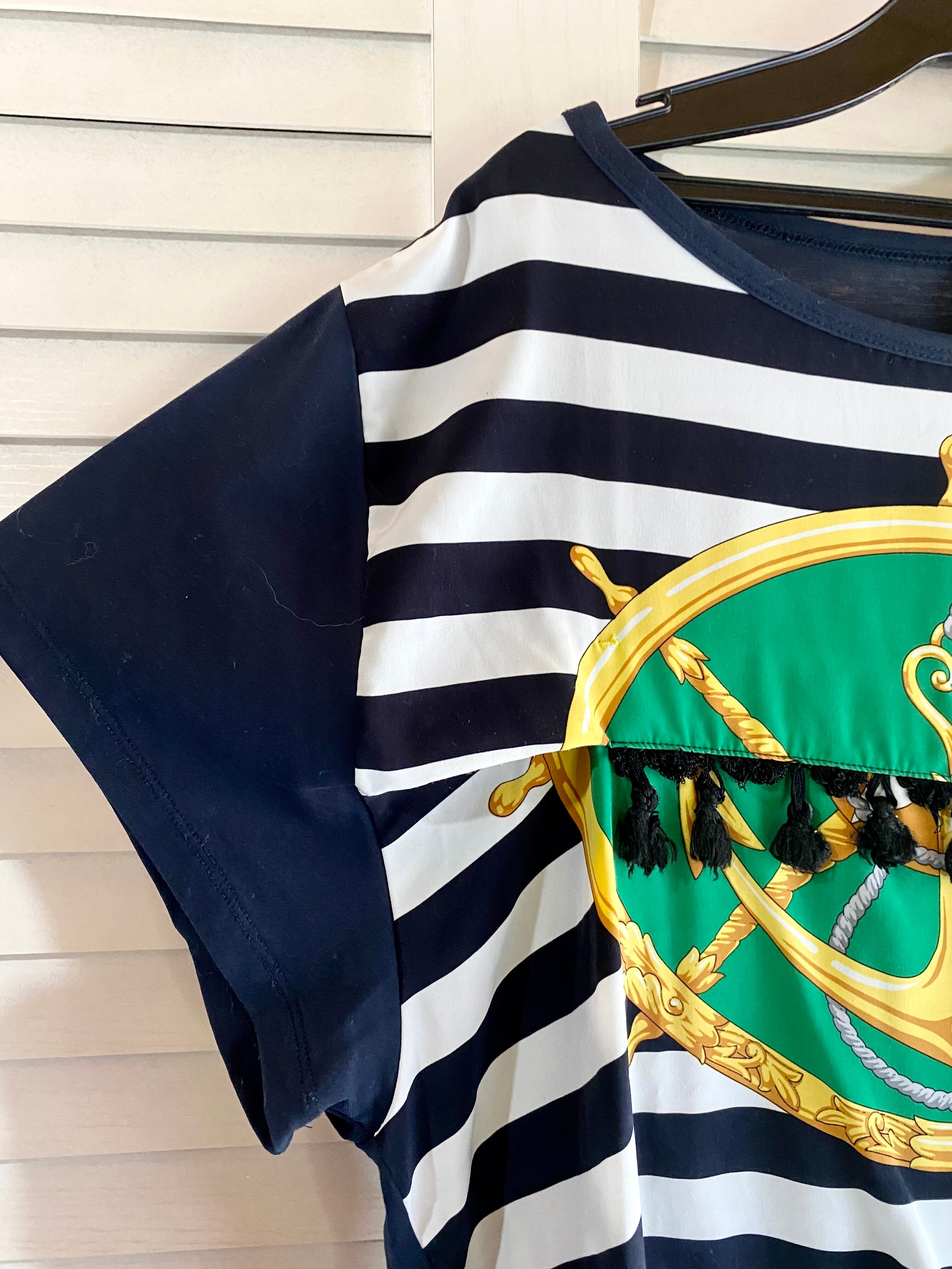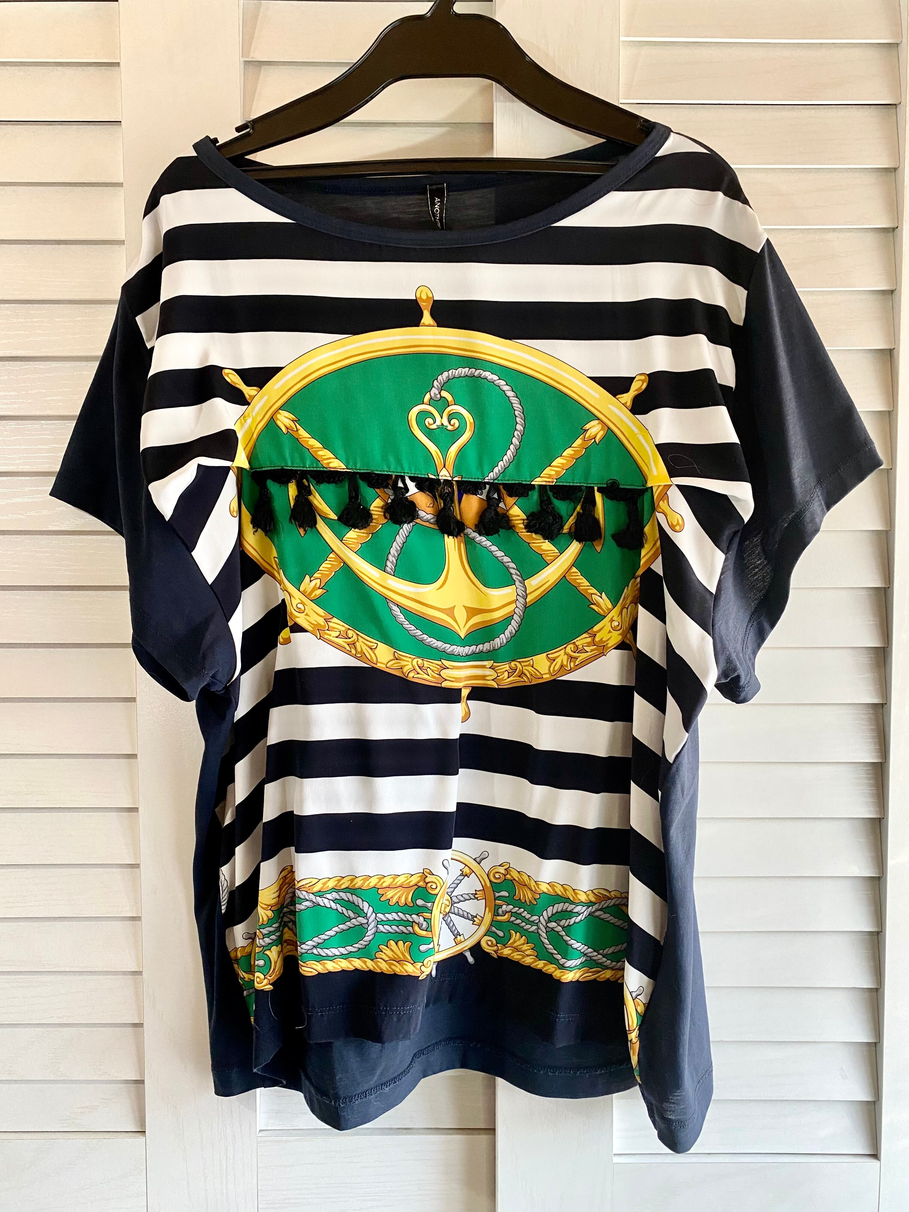 #173 Another EDITION マリンボーダー柄スカーフ切替 タッセルブレードカットソーブラウス ネイビー