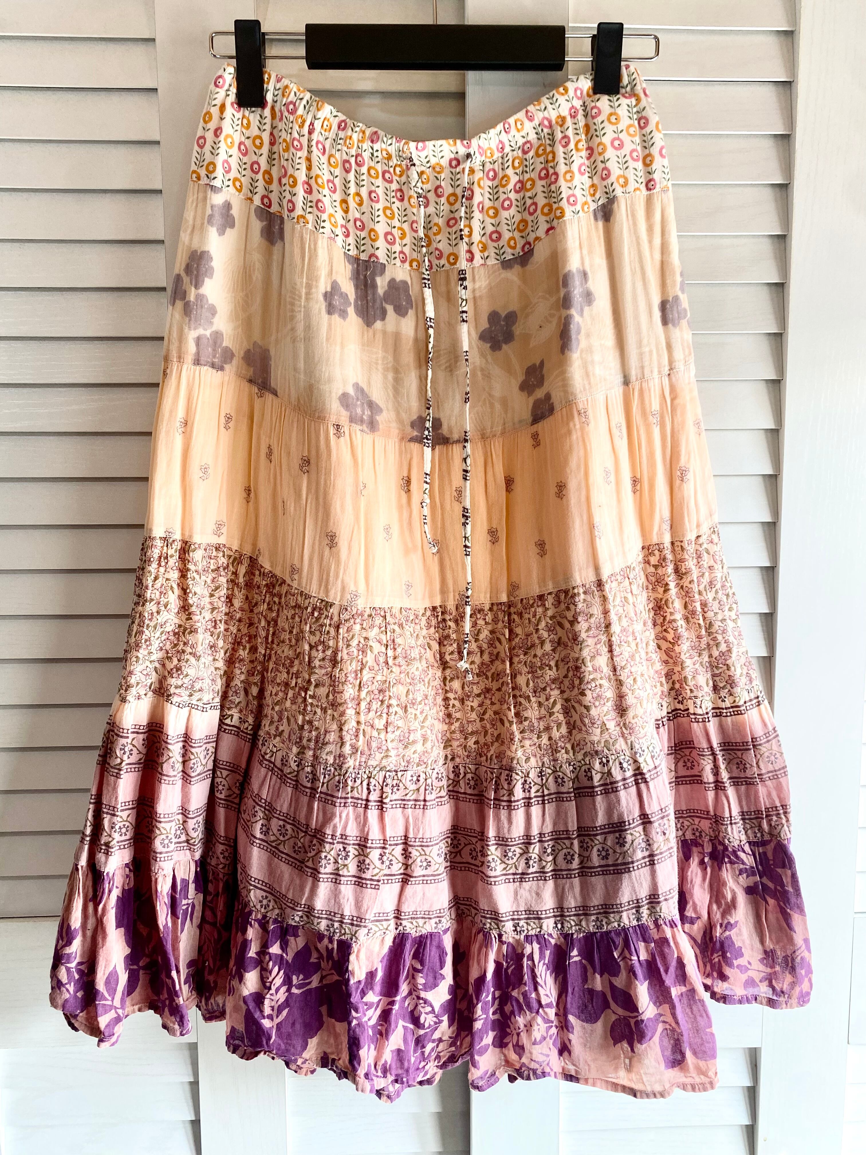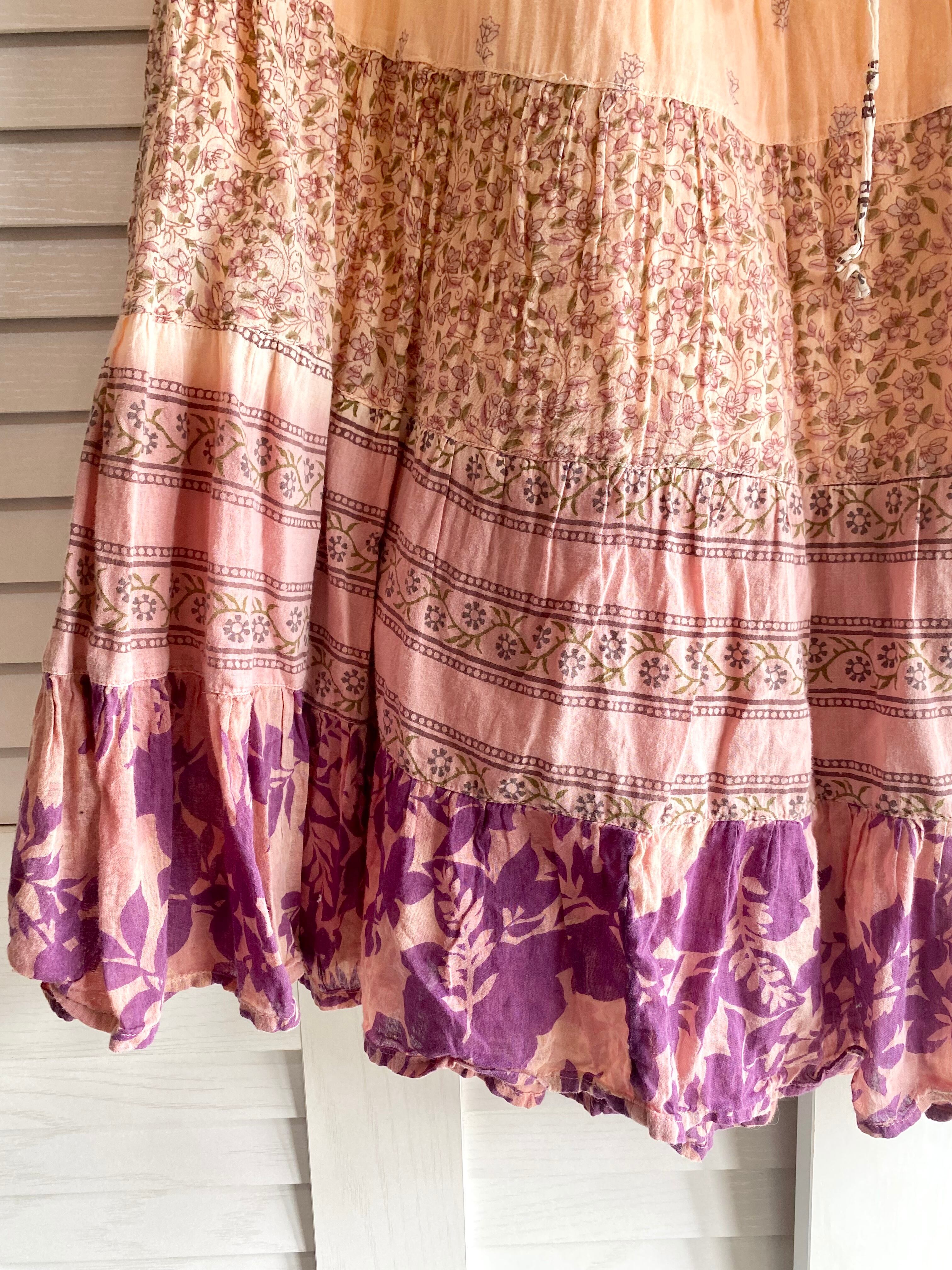 #181【デザインサンプル】コットンガーゼ パッチワークティアードスカート ピンクオレンジ