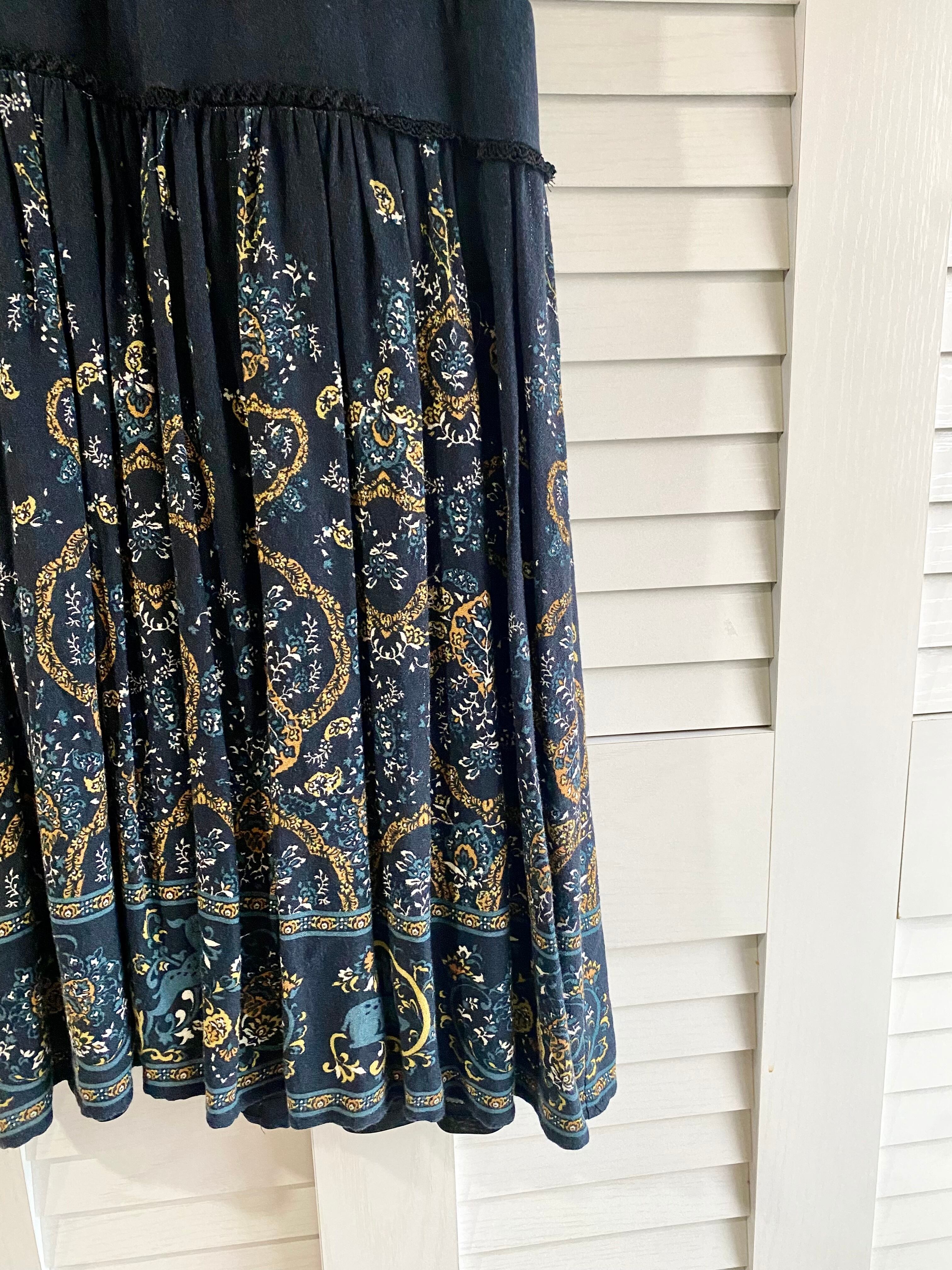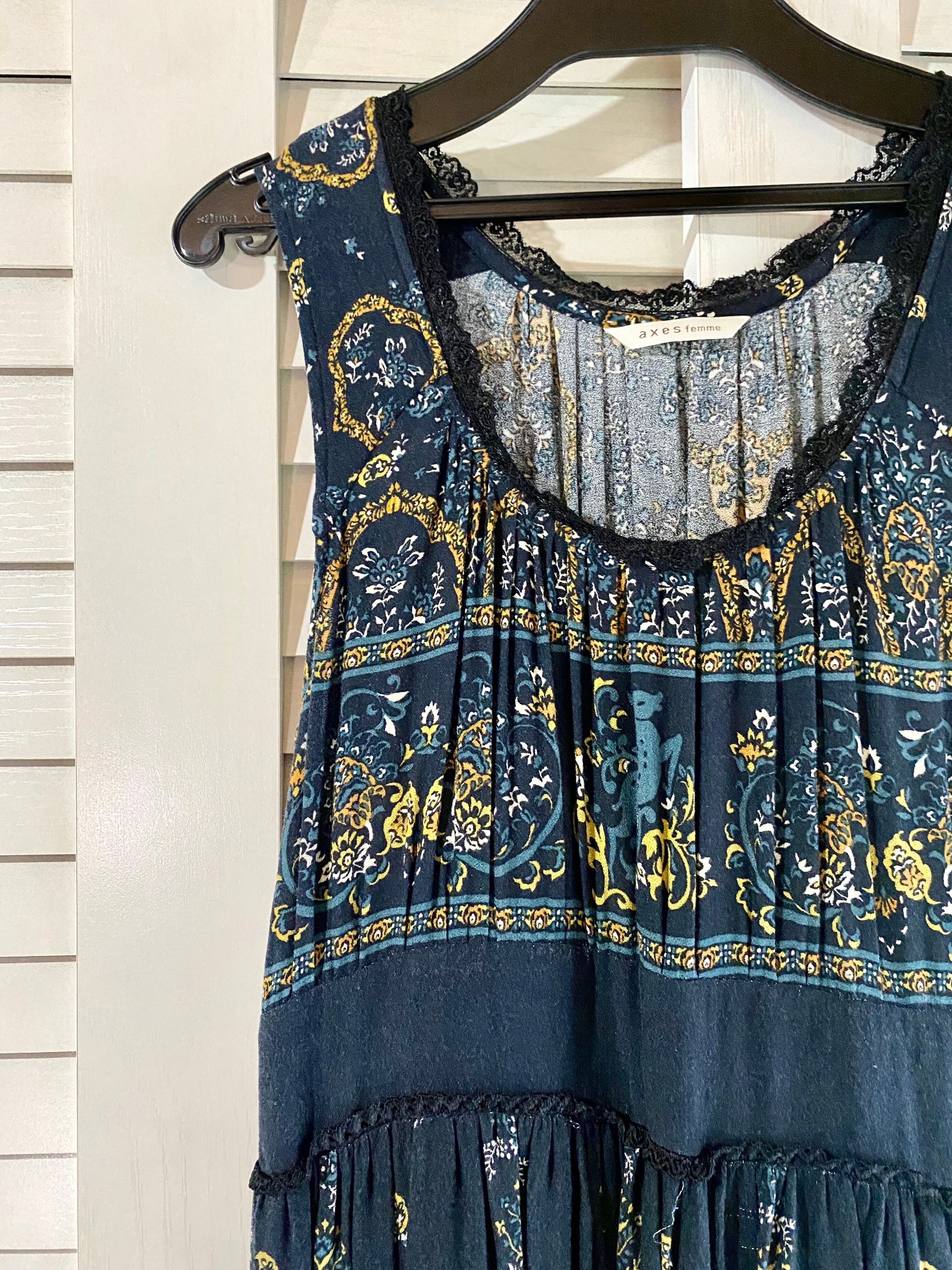 #200 axes femme ヨーロピアンオリエンタル柄ウエスト切替ノースリーブ ストレッチジョーゼットワンピ ブラック