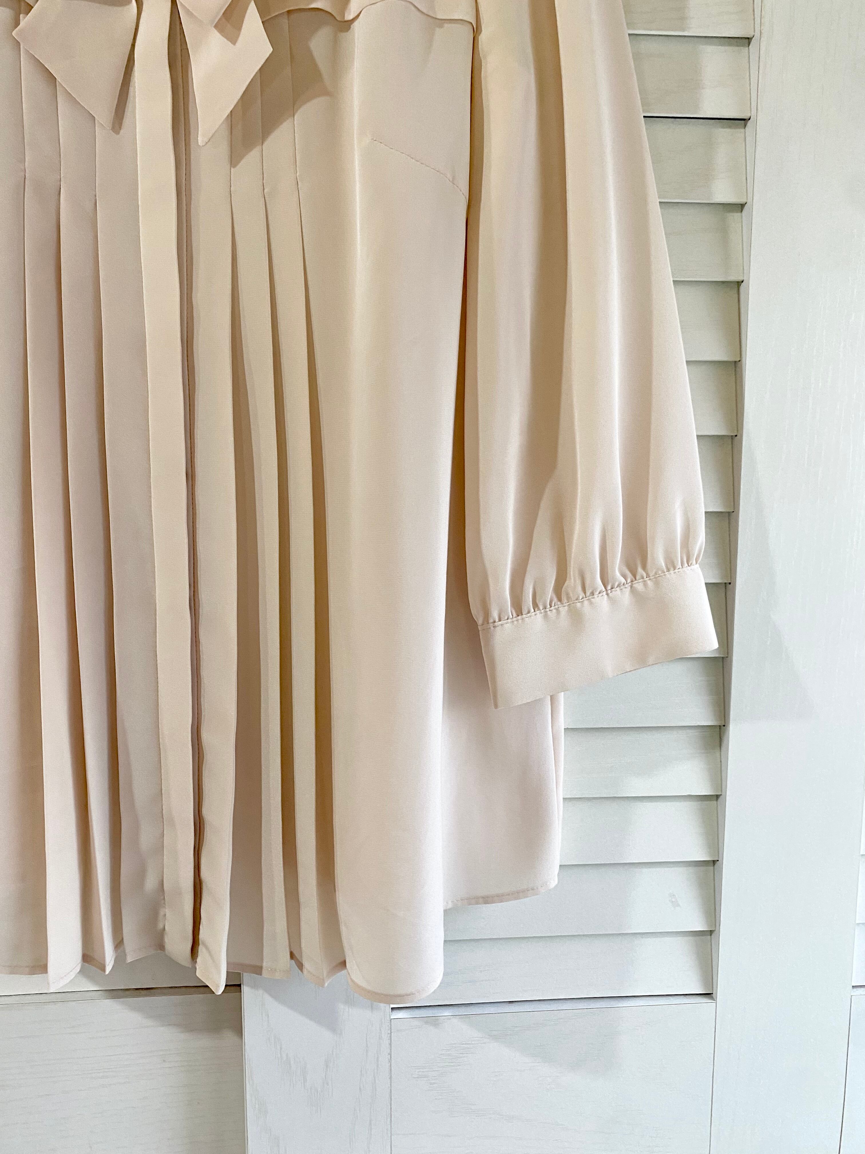 #200 LAISSE PASSE リボンブローチ 丸襟プリーツシフォンブラウス クリームベージュ