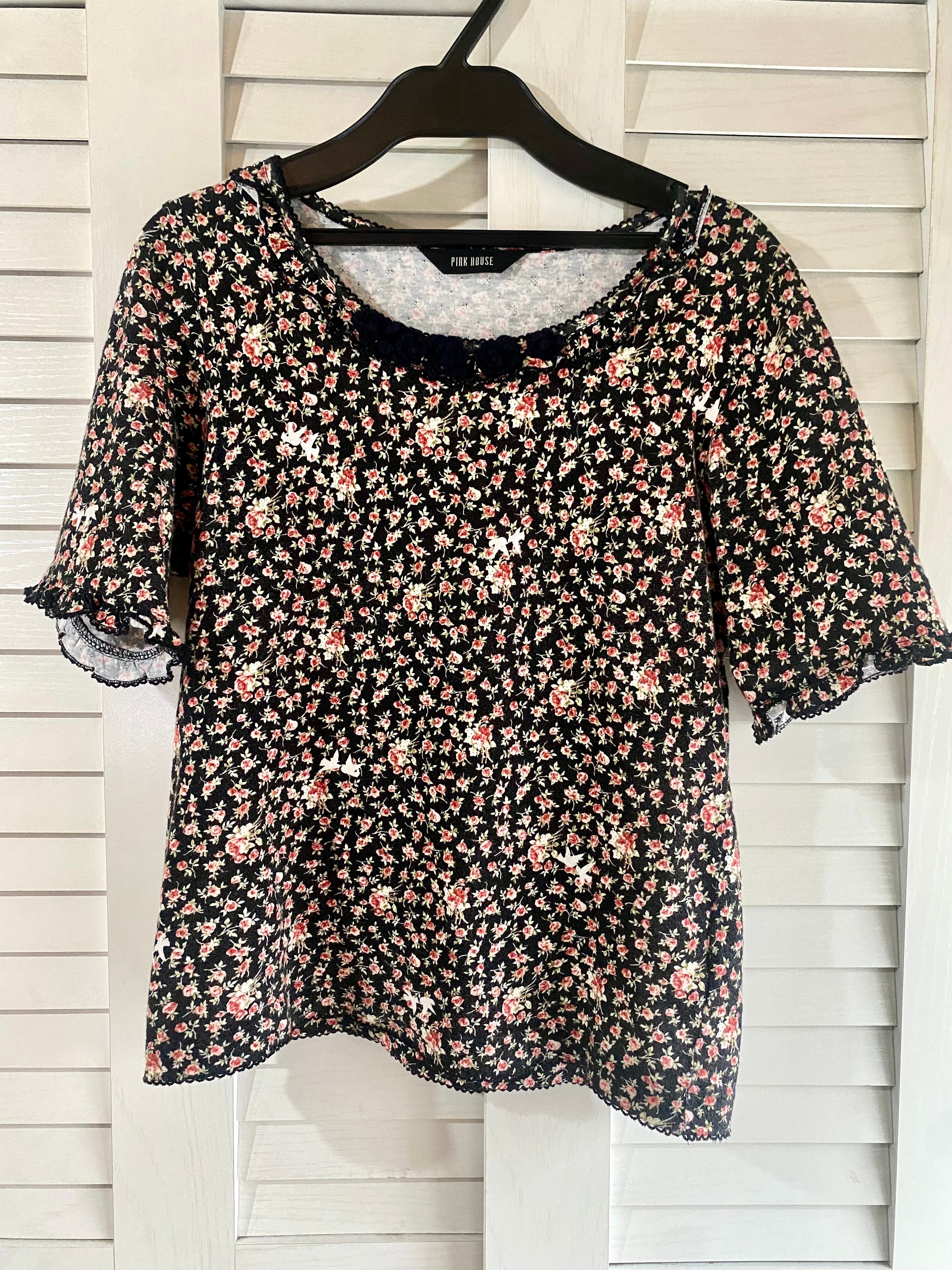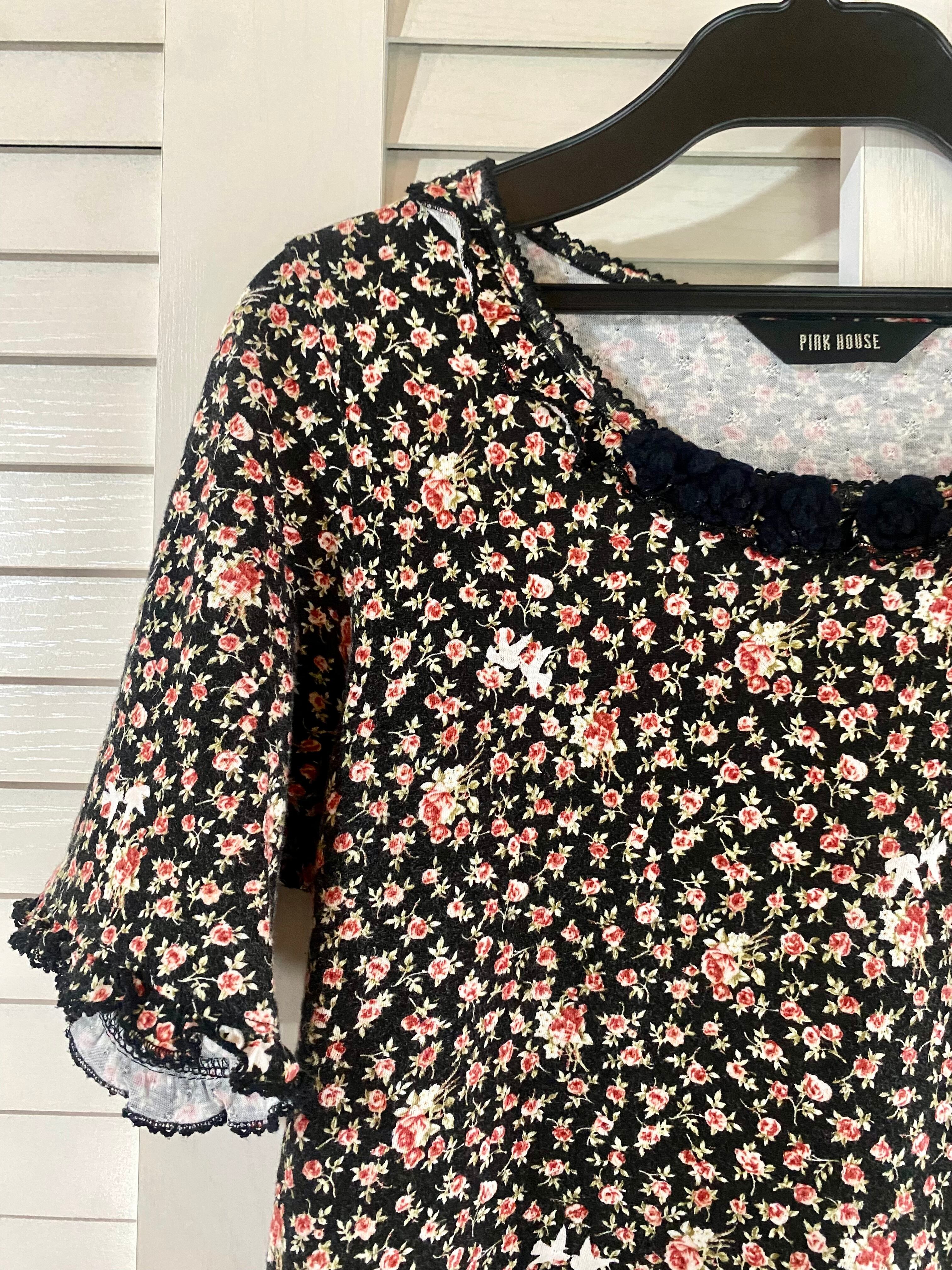 専用◎#203 PINK HOUSE 激レア!カメリアモチーフ&ピコットレースフリル 小花柄カットソー ブラック