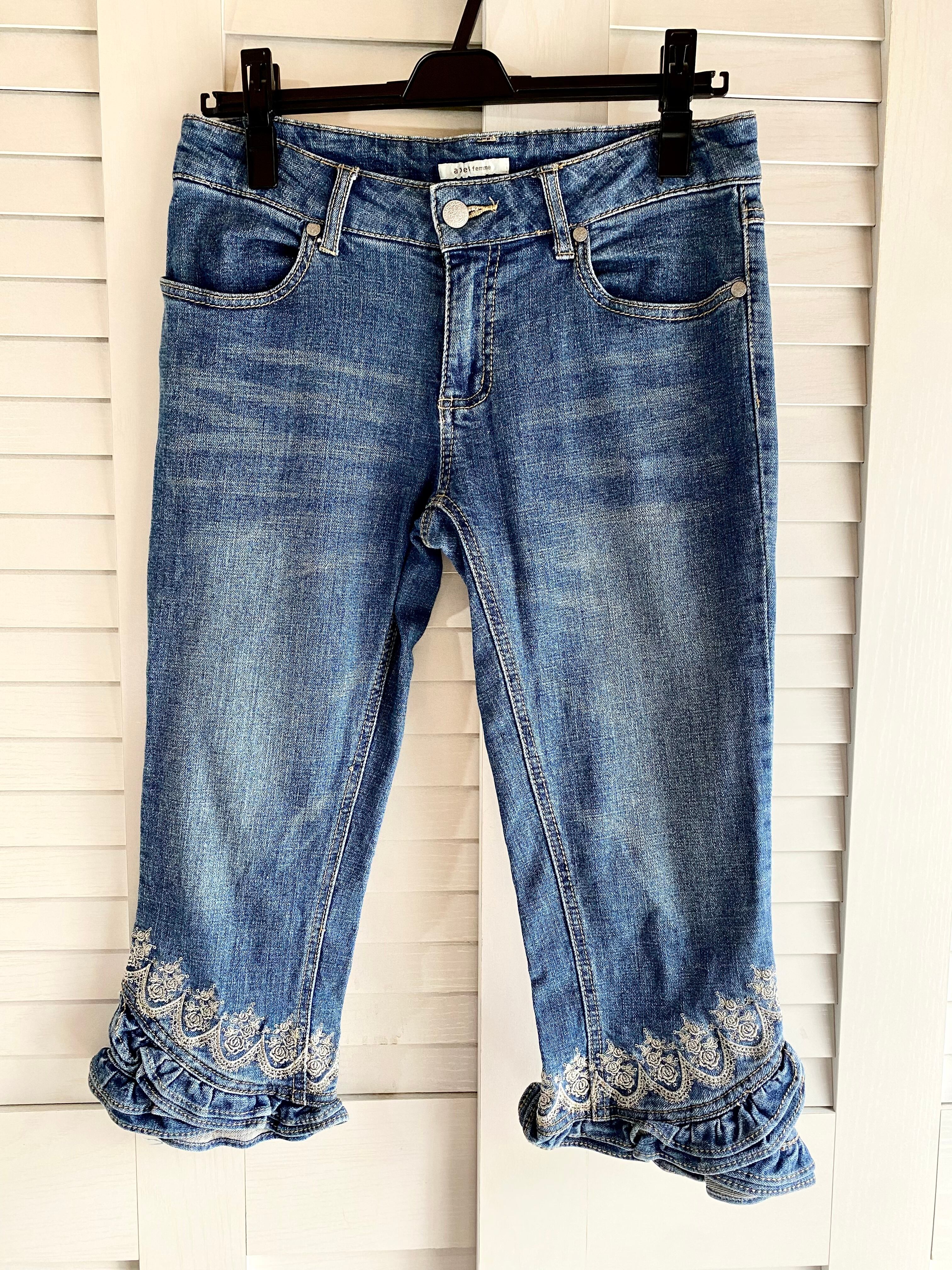 #206 axes femme ゴールド刺繍&フリル スーパーストレッチ クロップドデニムパンツ ライトブルー