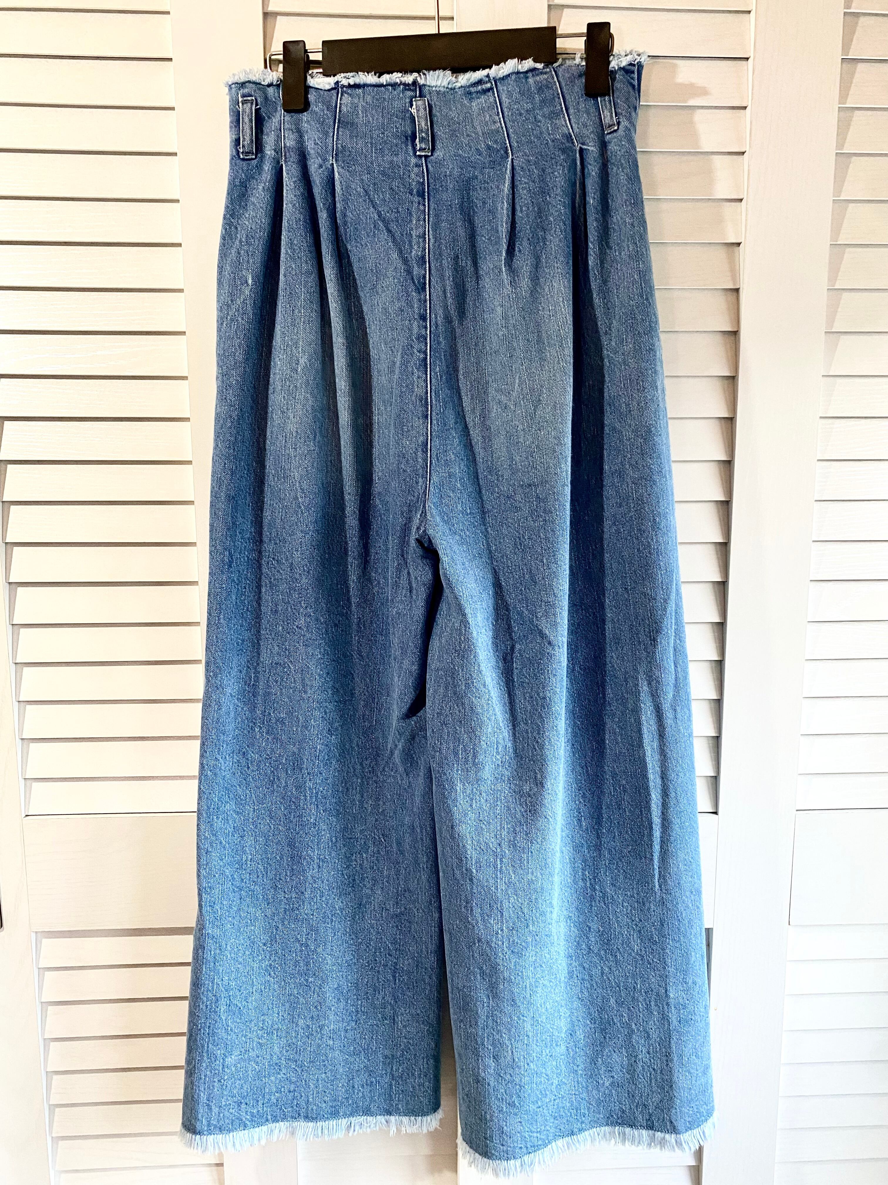 #208 LOWRYS FARM ウエスト&ヘムラインフリンジ ツータックハイウエストデニムワイドパンツ ライトブルー