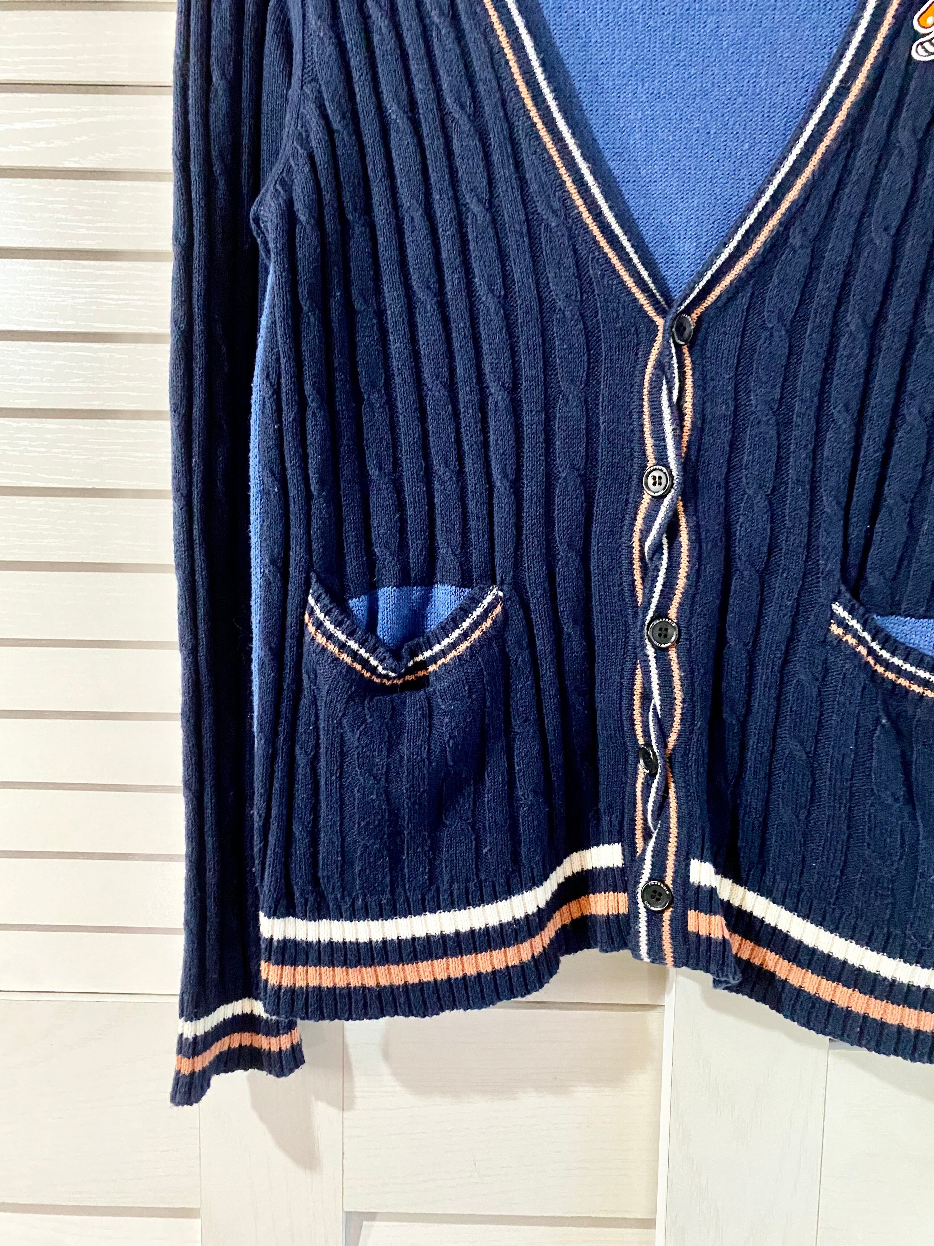 #209 FRAPBOIS きのこパッチド ライン入りバイカラーコットンニットカーデ ネイビー