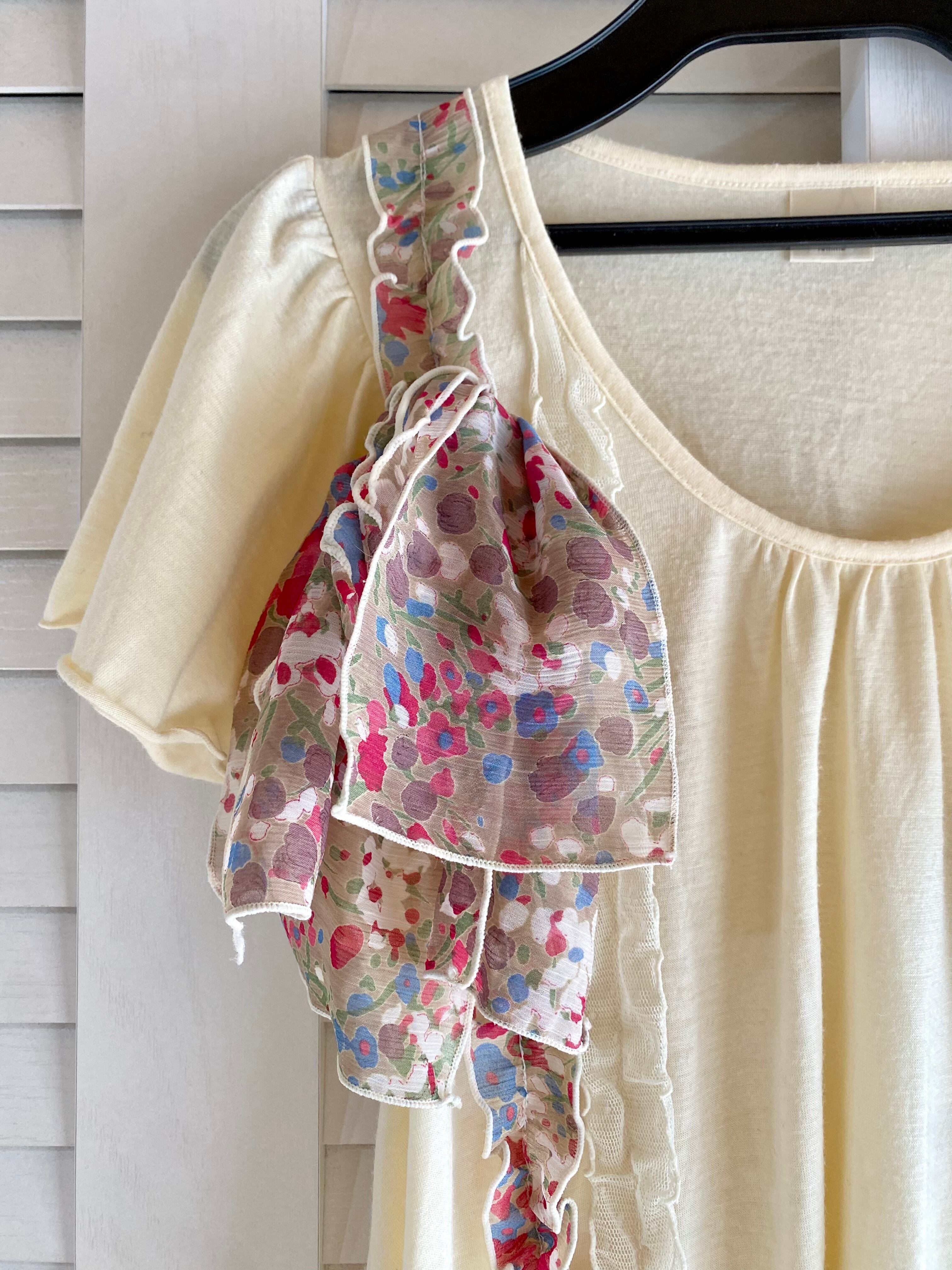 #210 axes femme フラワーフリルリボンモチーフ イレギュラーヘムコットンニットカットソー クリーム