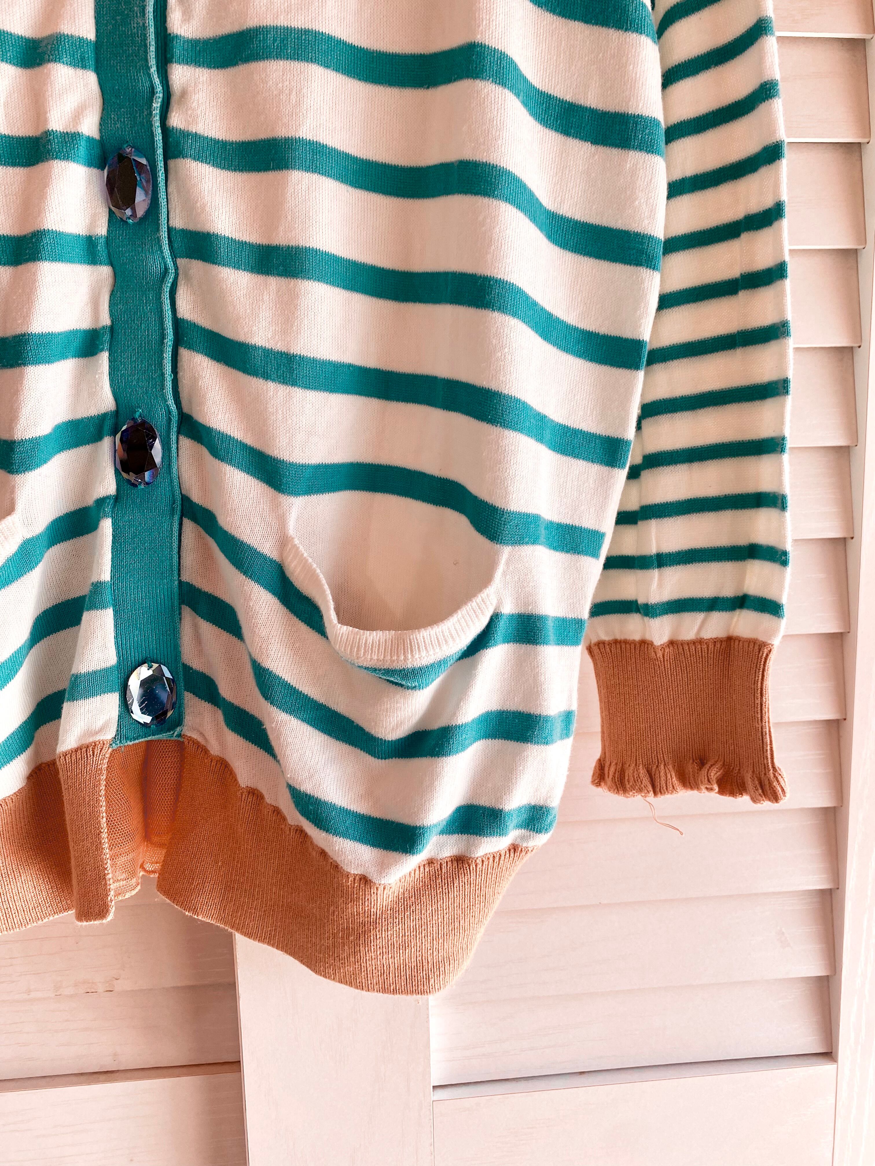 #214 MARILYN MOON ビジューボタン ボーダーコットンレーヨンニットカーデ ライトブルー