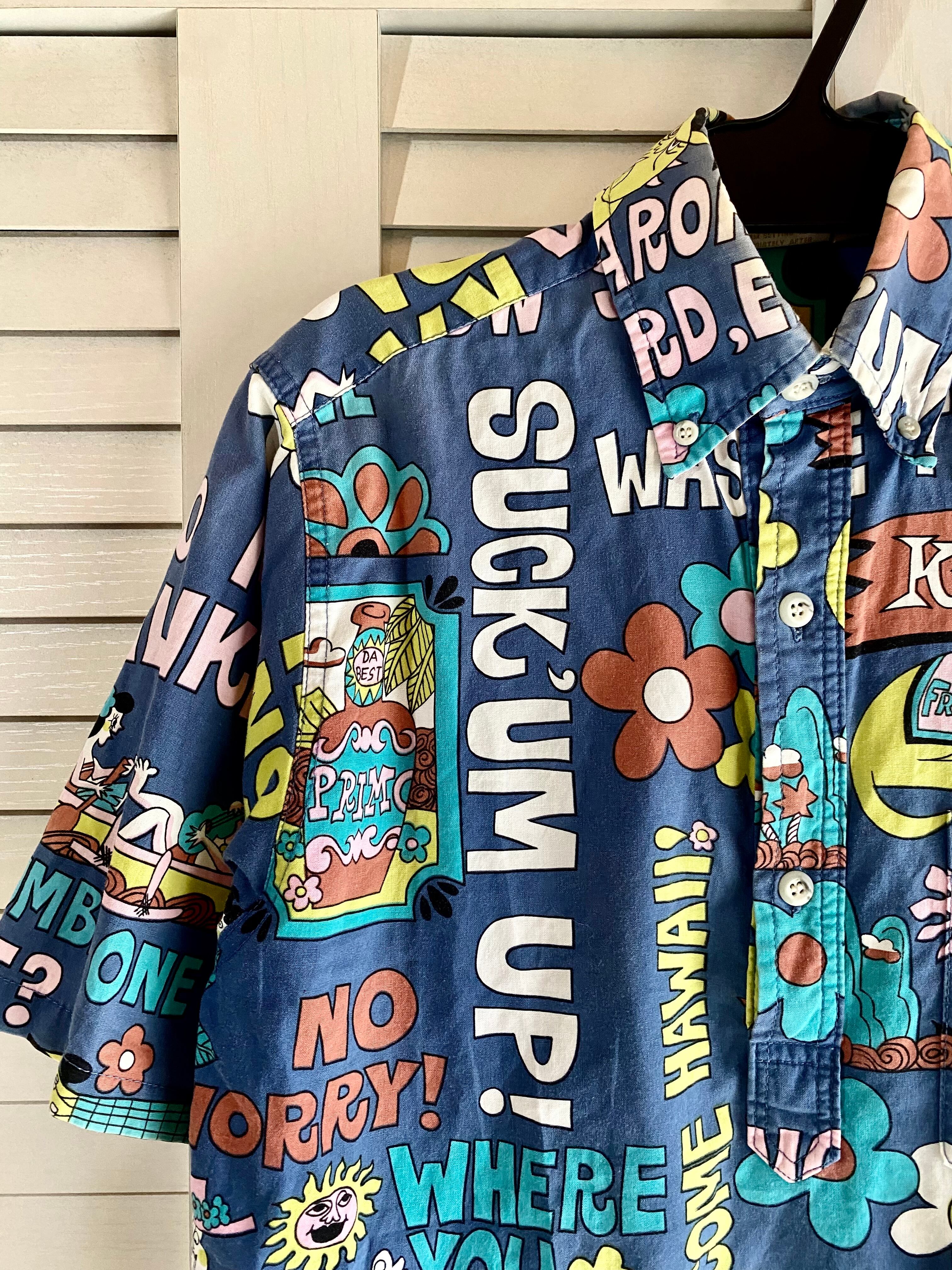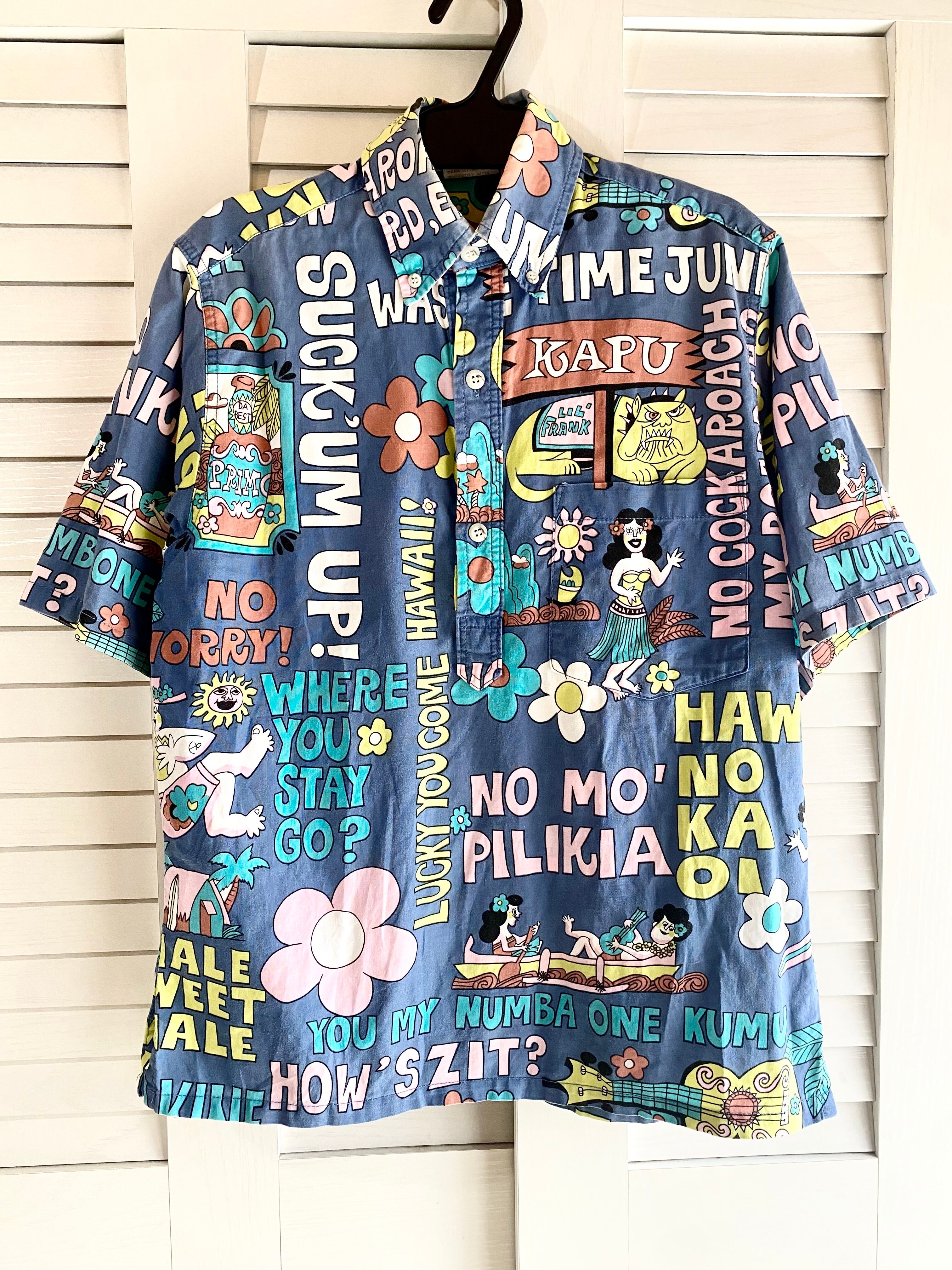 ❤︎【古着屋購入】70Sヴィンテージ ハワイアンイラストプルオーバーコットンシャツ ブルー
