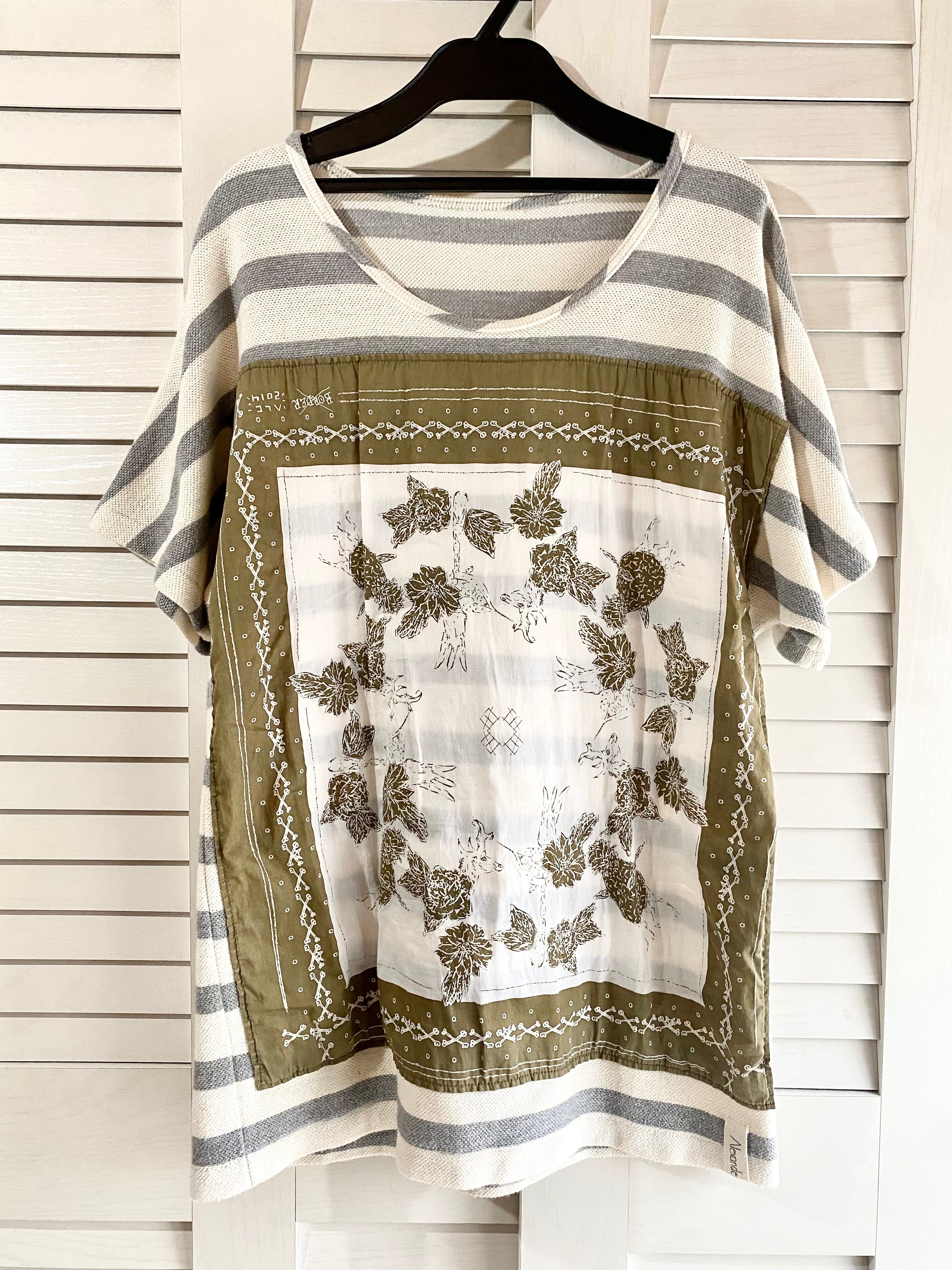 #224 Alexander Lee Chang バンダナパッチワーク オーバーサイズカノコ地ボーダーカットソー ライトグレー