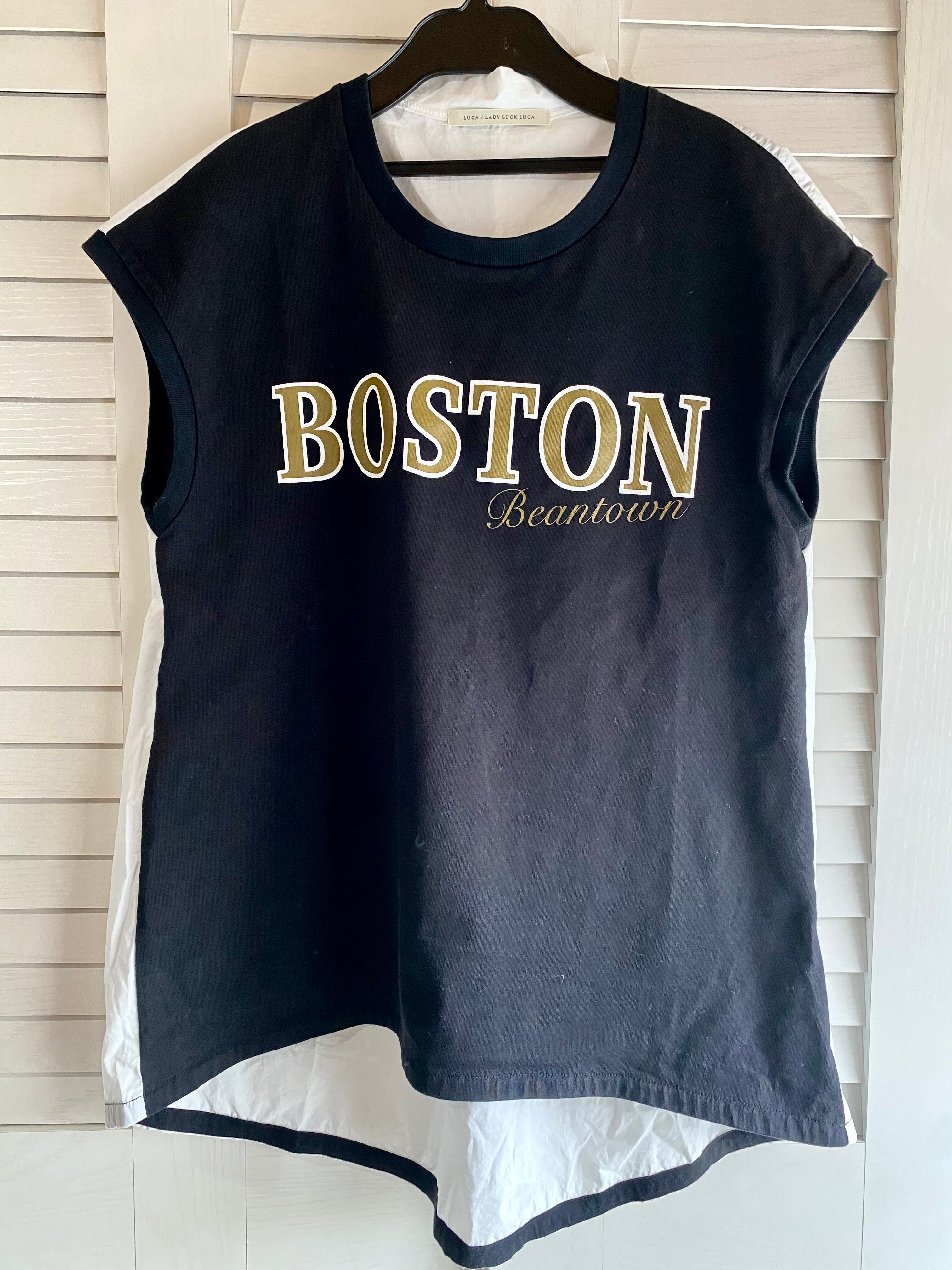 専用◎#226 LUCA LADYLUCK LUCA カレッジプリント フレンチスリーブ バックシャツ切替カットソー ブラック×オフホワイト