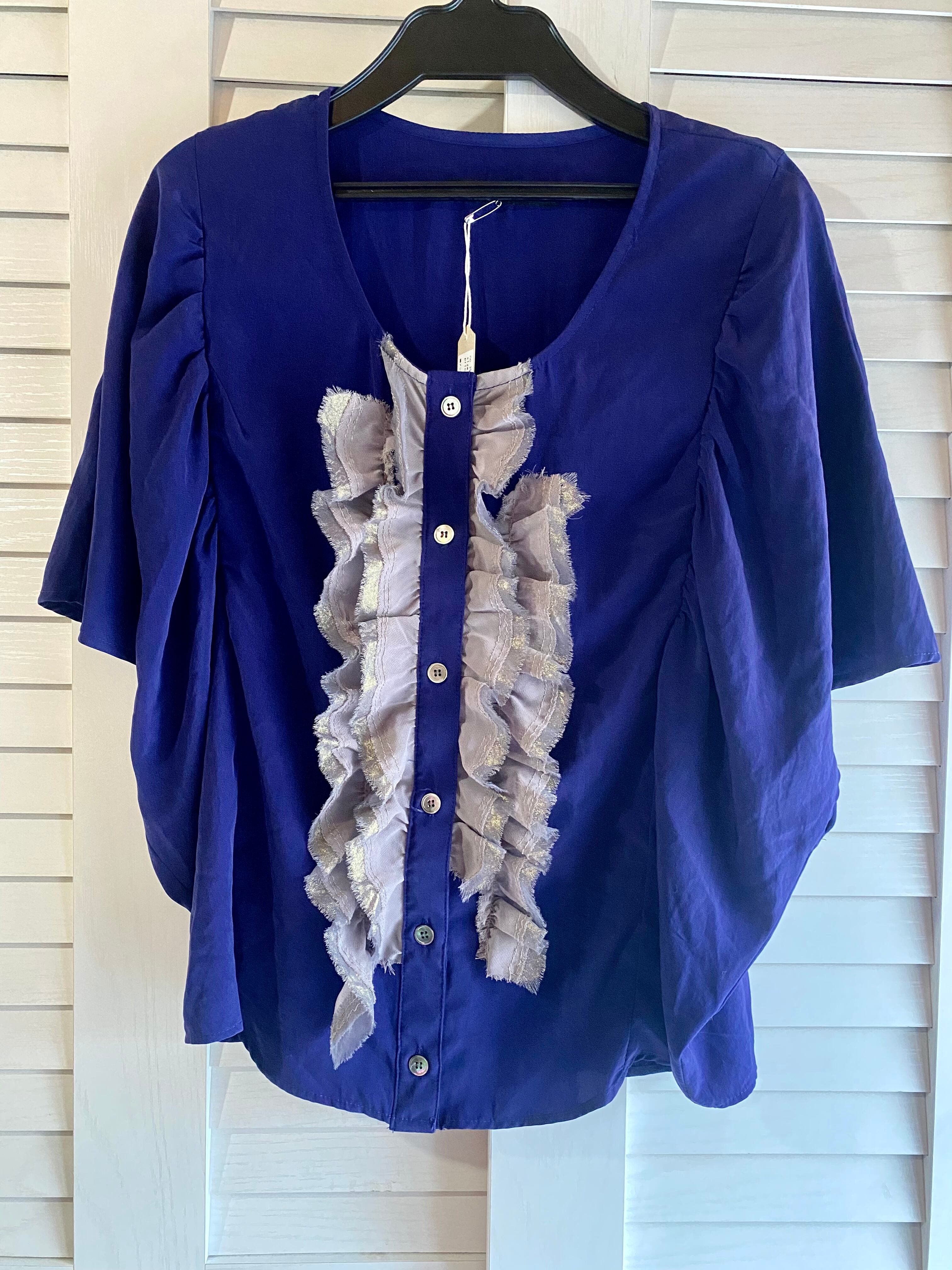 #235 global rythme essence タマムシフリル デザイン切替ノーカラーブラウス ネイビー