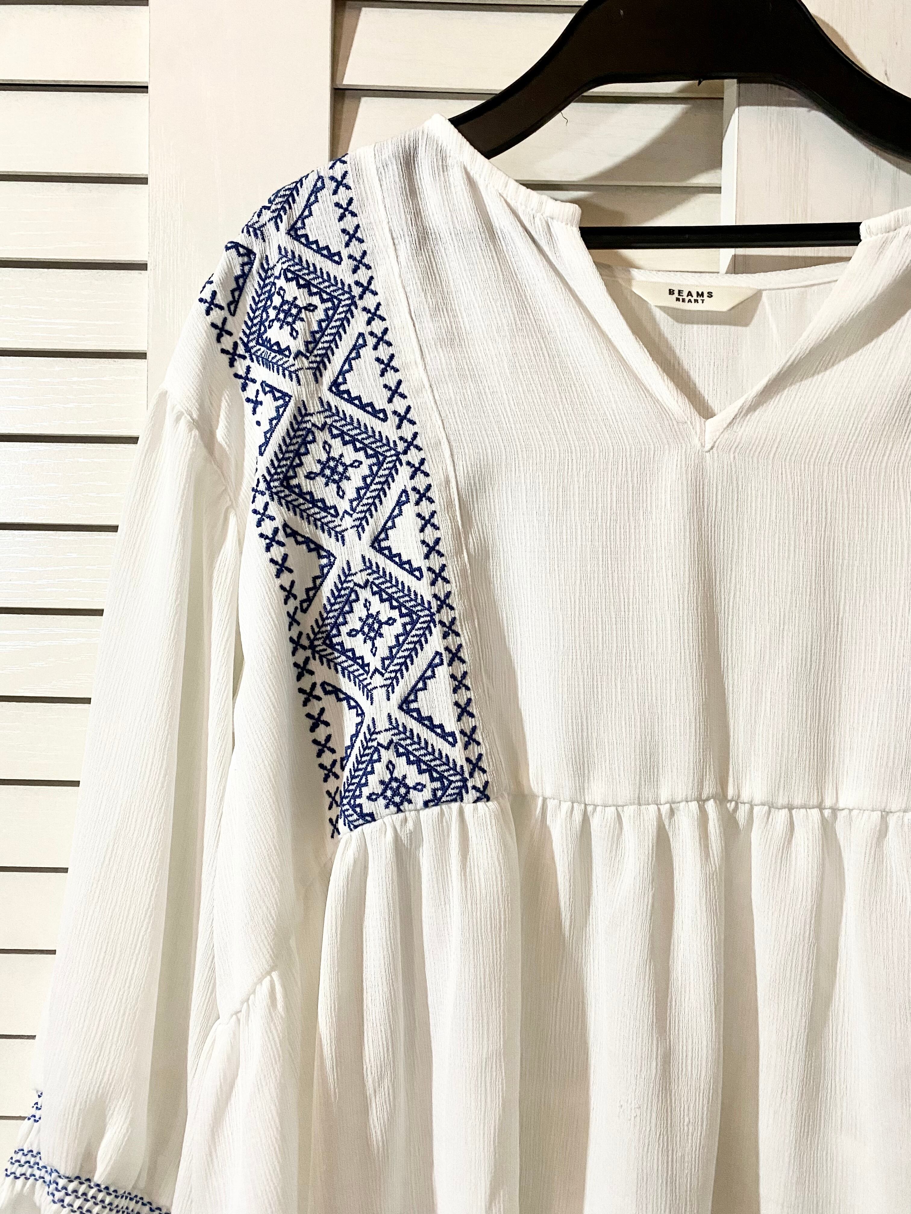 #237 BEAMS ステッチ刺繍 楊柳ジョーゼットオーバーブラウス オフホワイト
