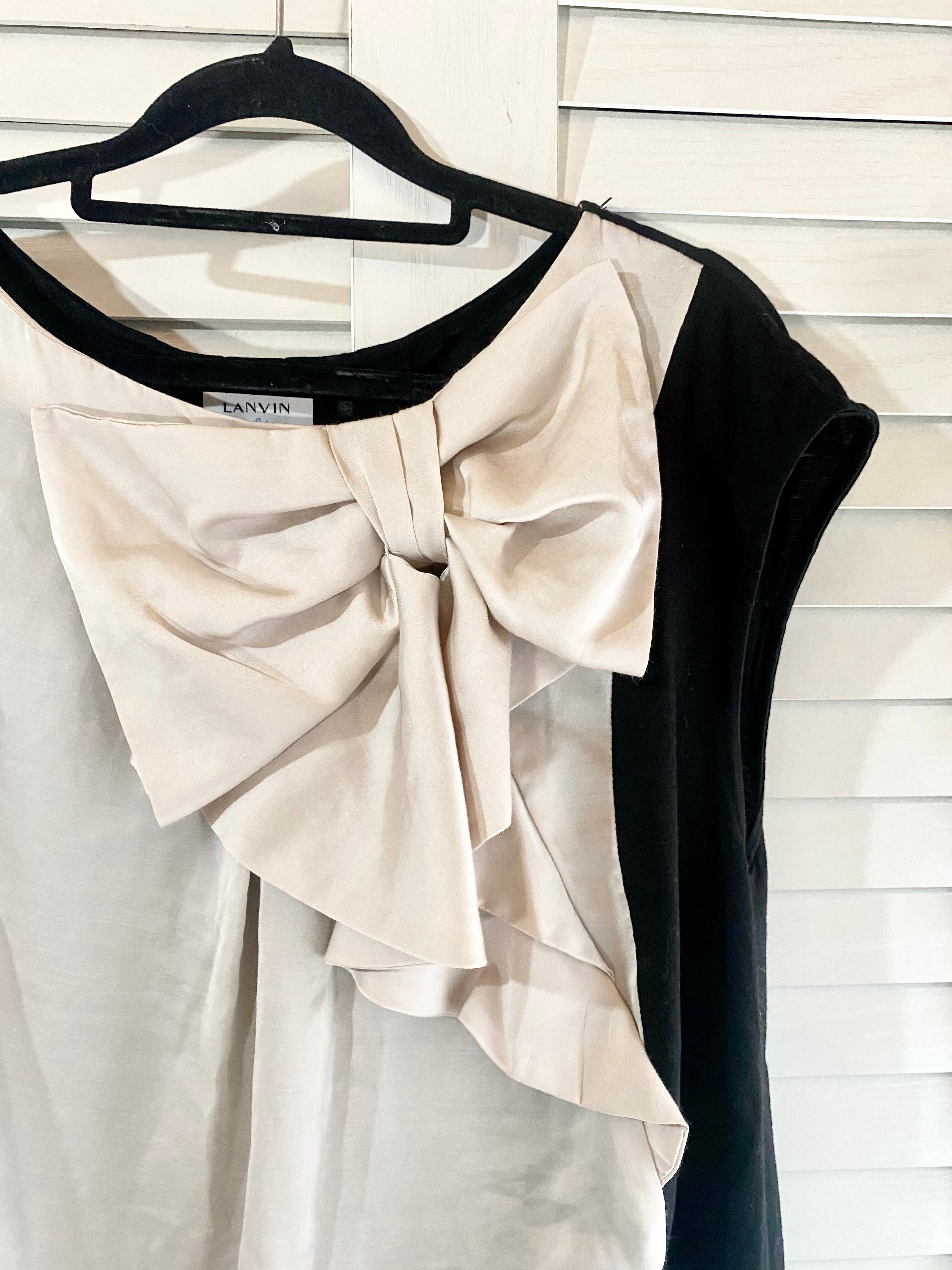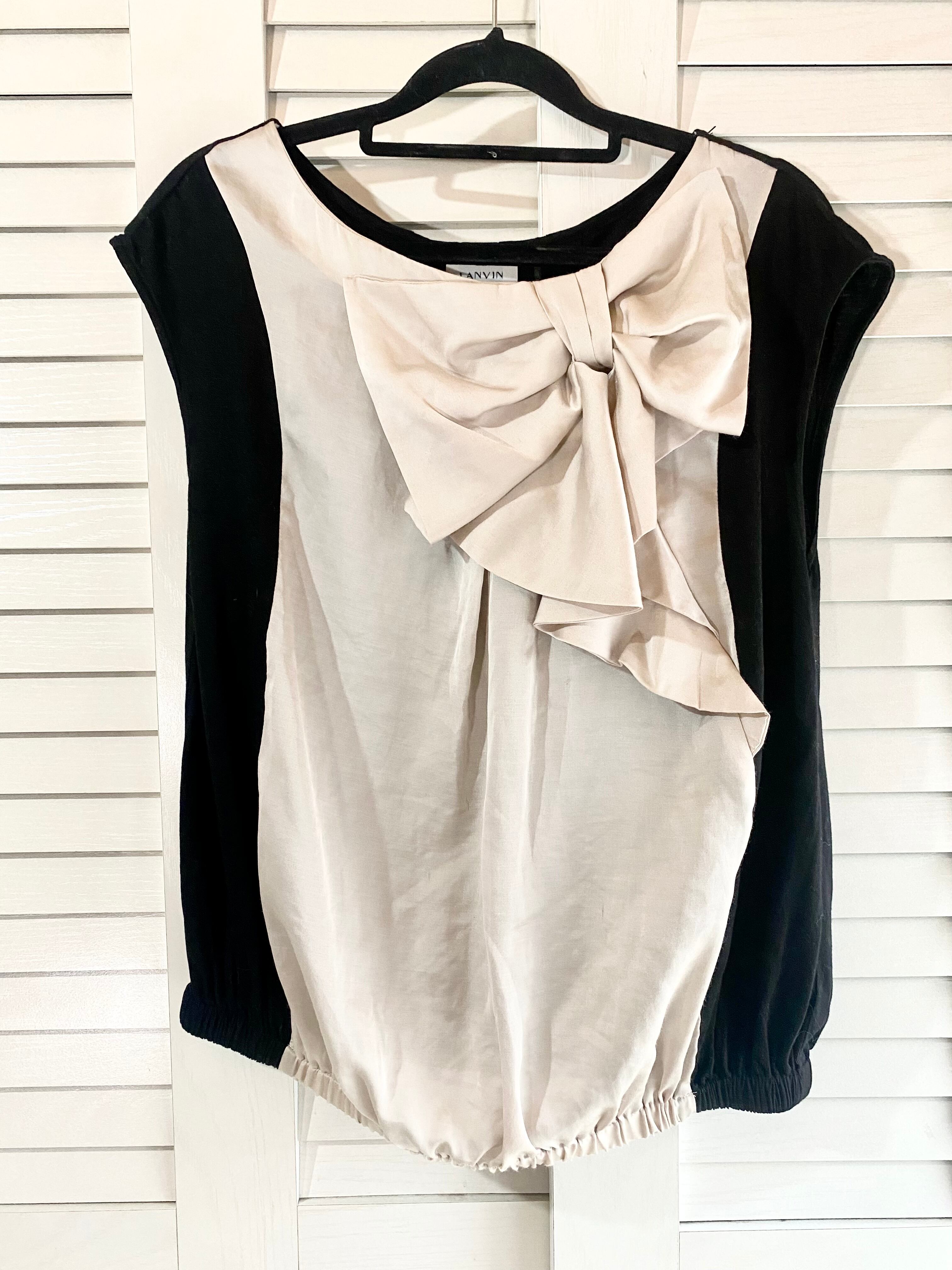 #243 LANVIN サテンBIGリボン カットソーコンビブラウス アンティークベージュ×ブラック