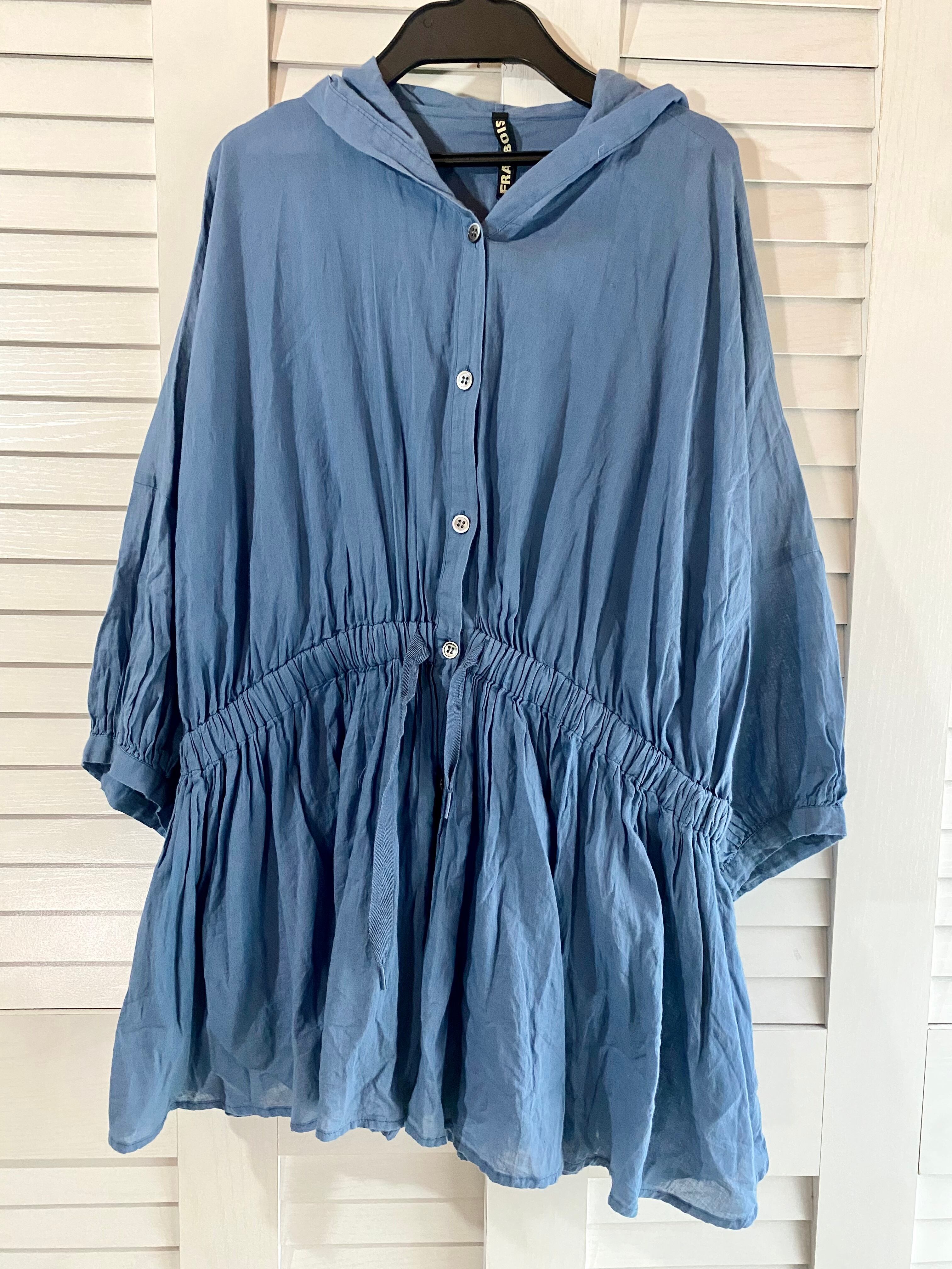 #243 FRAPBOIS ウエストドロストロ オーバサイズフーディコットンレーヨンシャツ スモーキーブルー