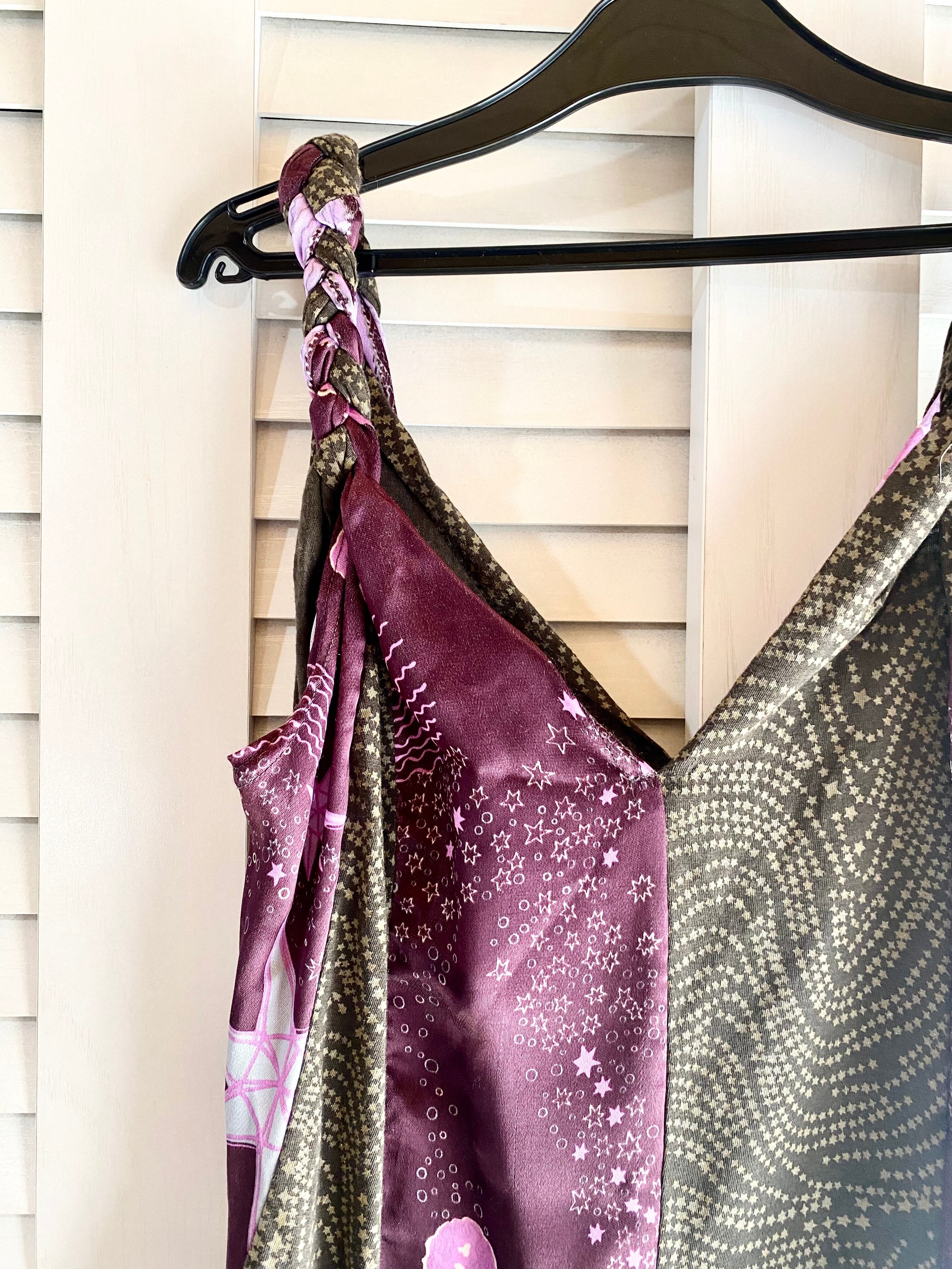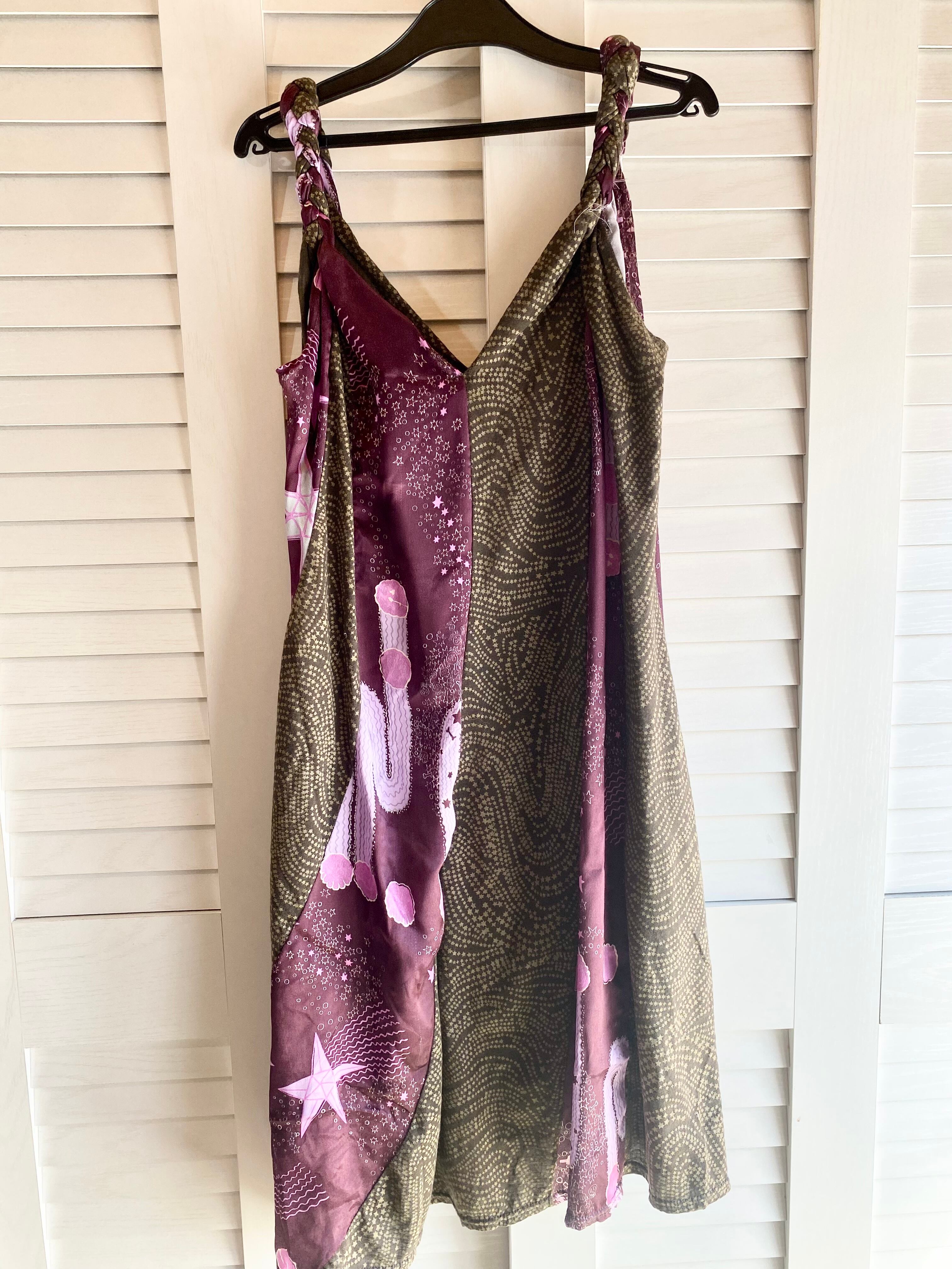 #244 gomme オリジナルサテンテキスタイル 変形パッチワークワンピ パープル×カーキ